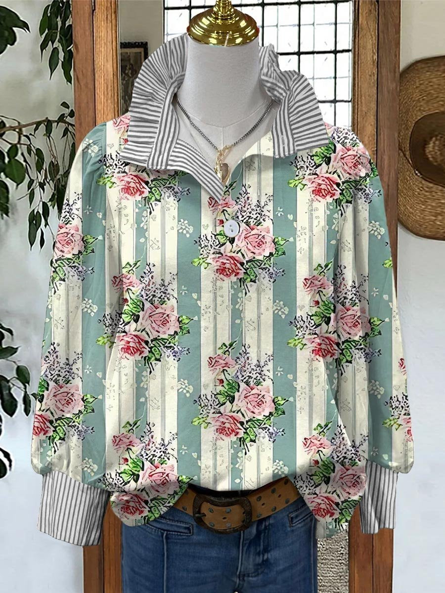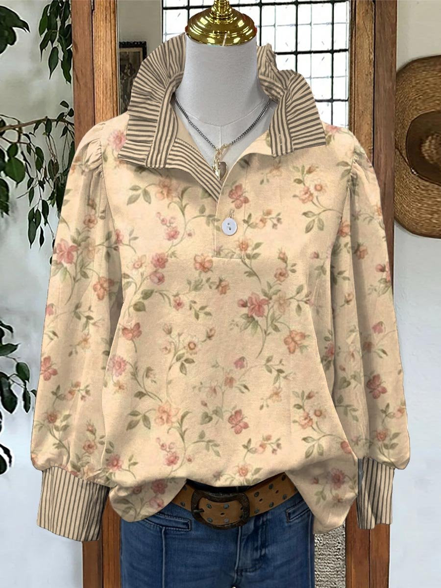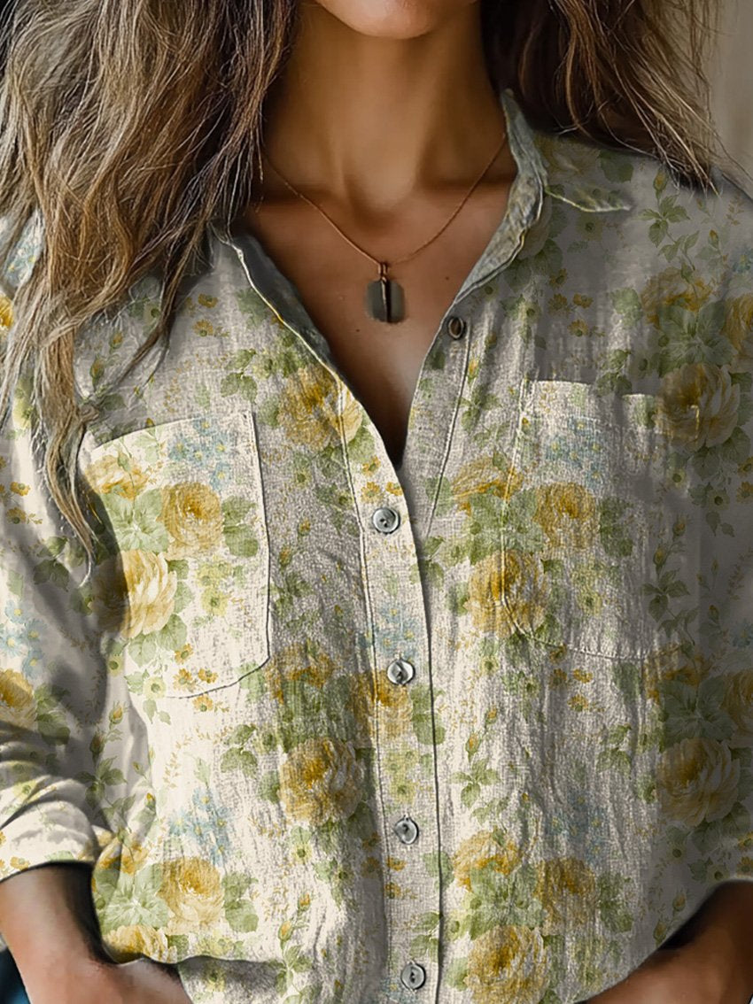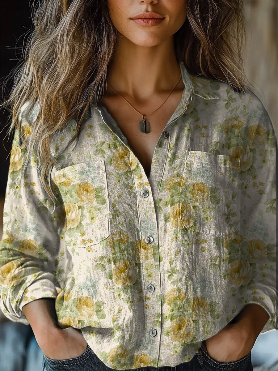 Women's Vintage Lovely Floral Art Print Casual Long Sleeve Comfortable Cotton Shirt
