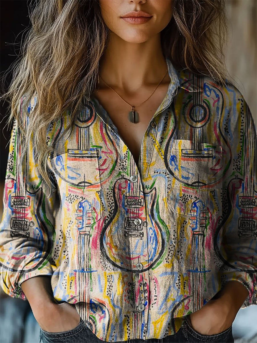 Women's Funny Guitar Pattern Art Print Casual Long Sleeve Comfortable Cotton Shirt