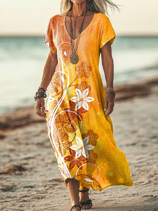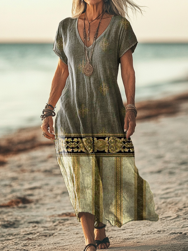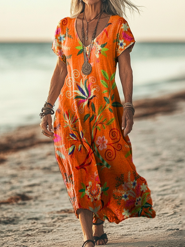 Women's Bohemian Floral Textured Art Patterns Print Short Sleeve Pocket Cotton Linen Dress