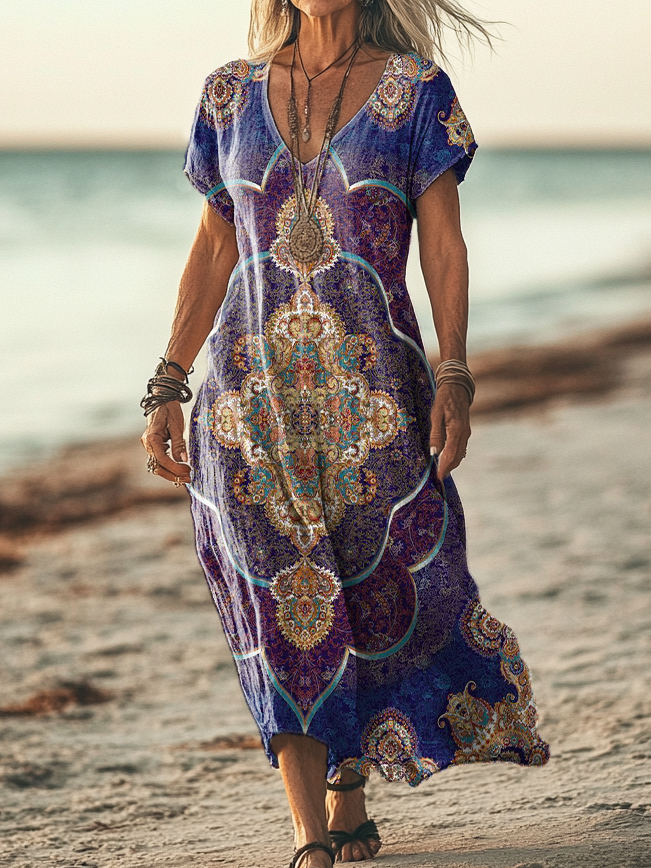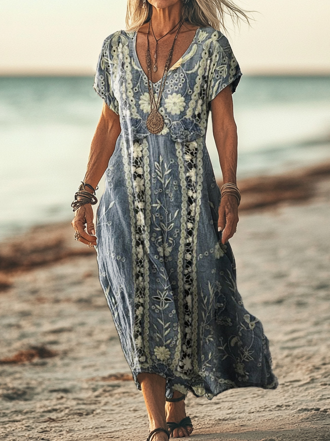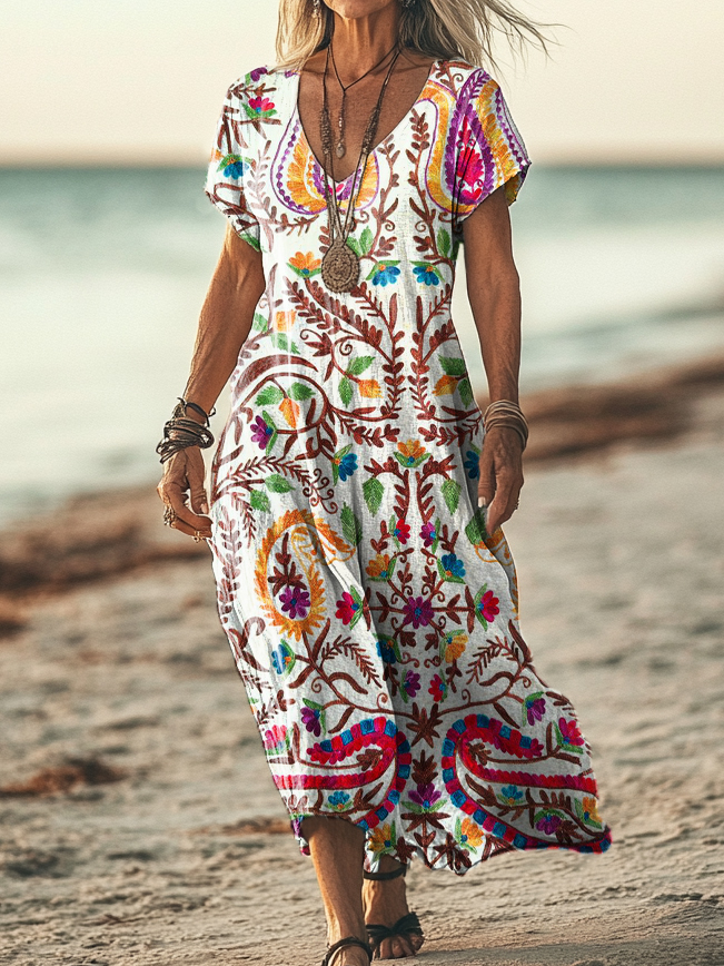 Women's Ethnic Flower Art Print V Neck Pocket Cotton Dress