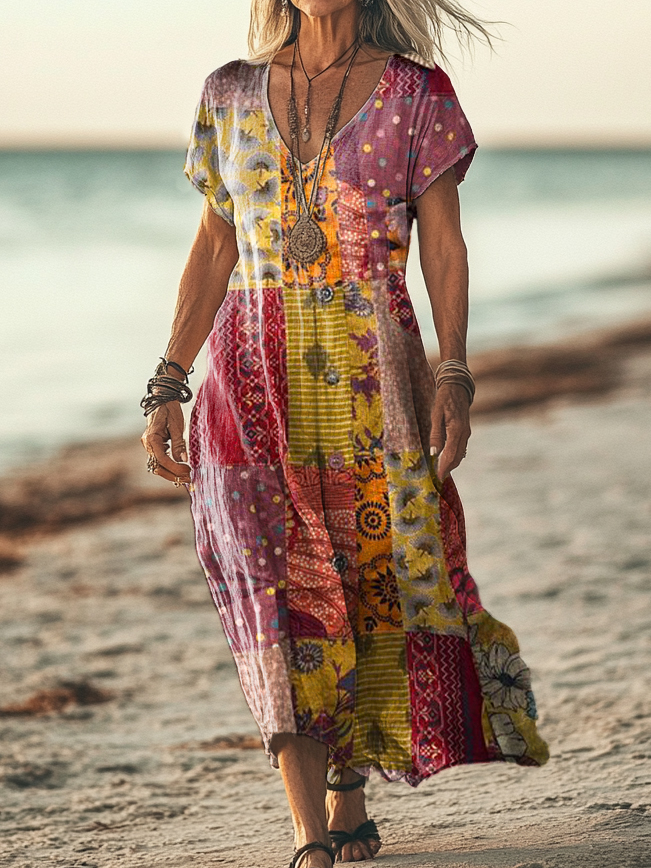 Women's Retro Ethnic Collage Art Pattern Print Pocket Cotton Dress