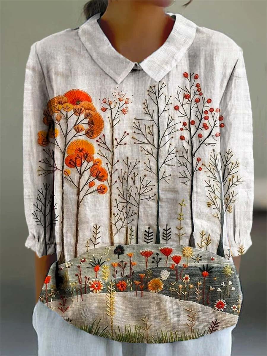 Women's Pastoral Flower Art Print Casual Cotton And Linen 3/4 Sleeve Shirt