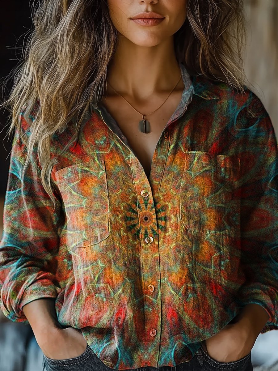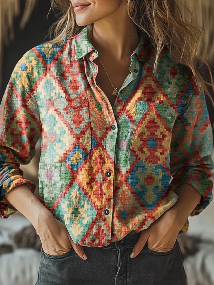 Women's Vintage Ethnic Geometric Art Print Long Sleeve Comfortable Cotton Shirt