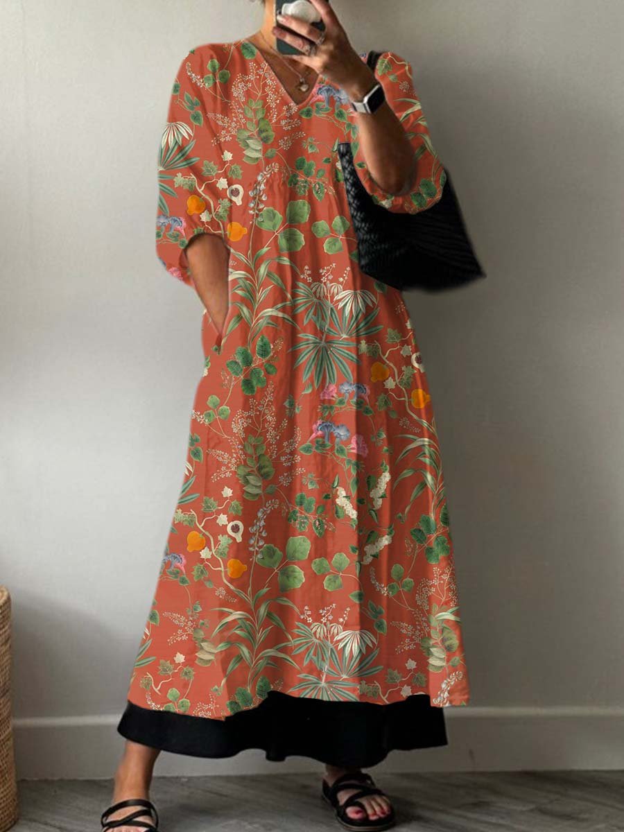 Women's Boho Vintage Floral Print Pocket V-neck Cotton Dress