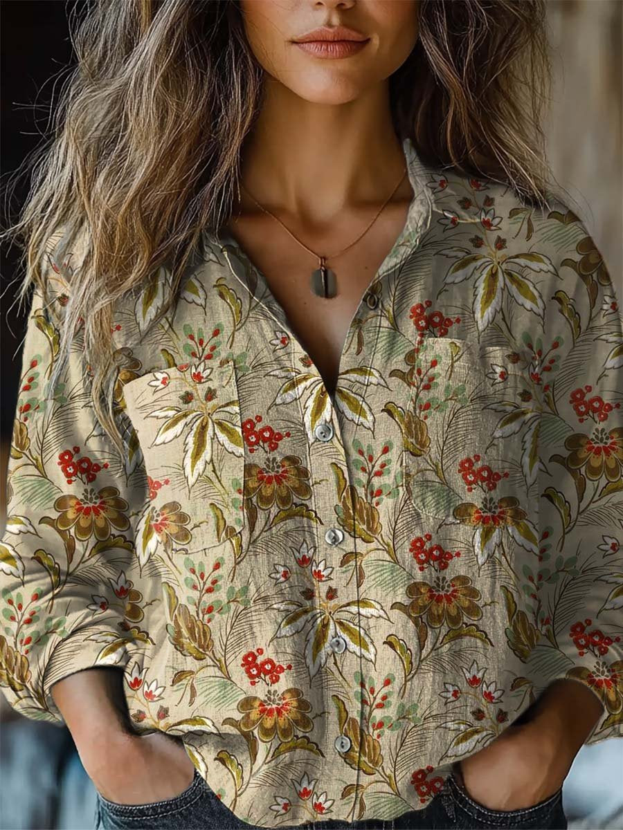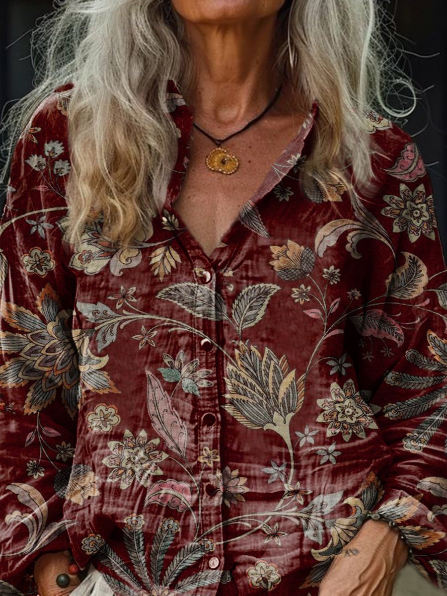 Women's Vintage Floral Art Print Casual Long Sleeve Comfortable Cotton Shirt