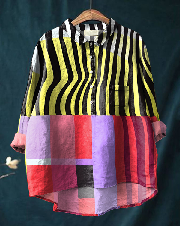 Vintage Abstract Color Block Art Print Cotton and Linen Shirt