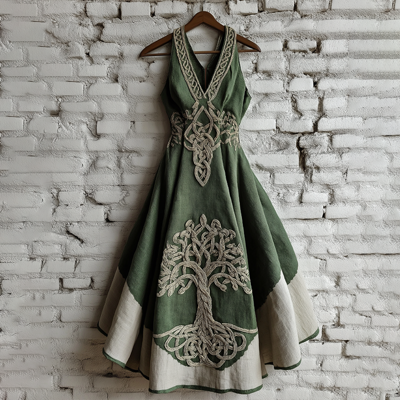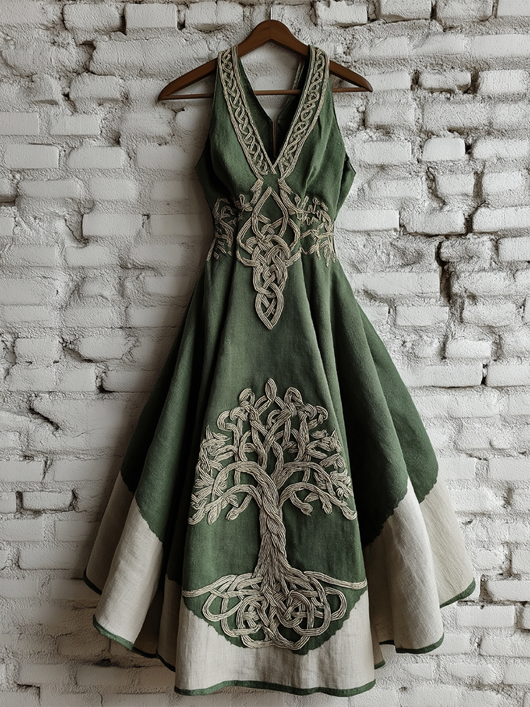 Women's Viking Celtic Knot Art Tree Of Life Patchwork Linen Midi Dress