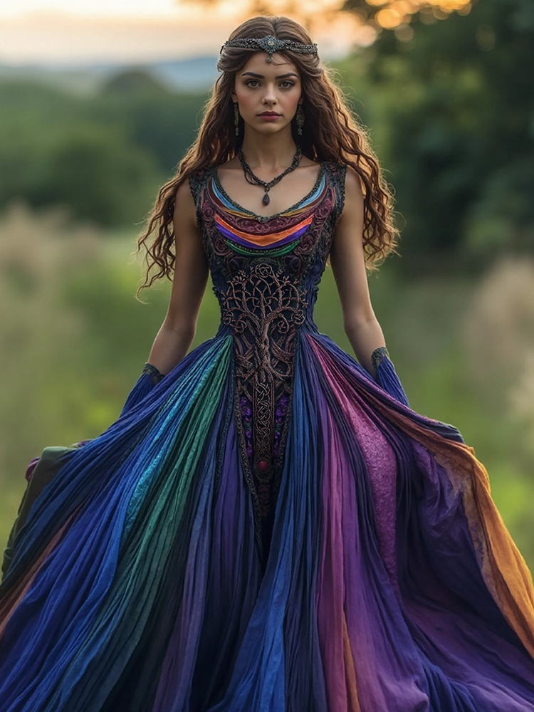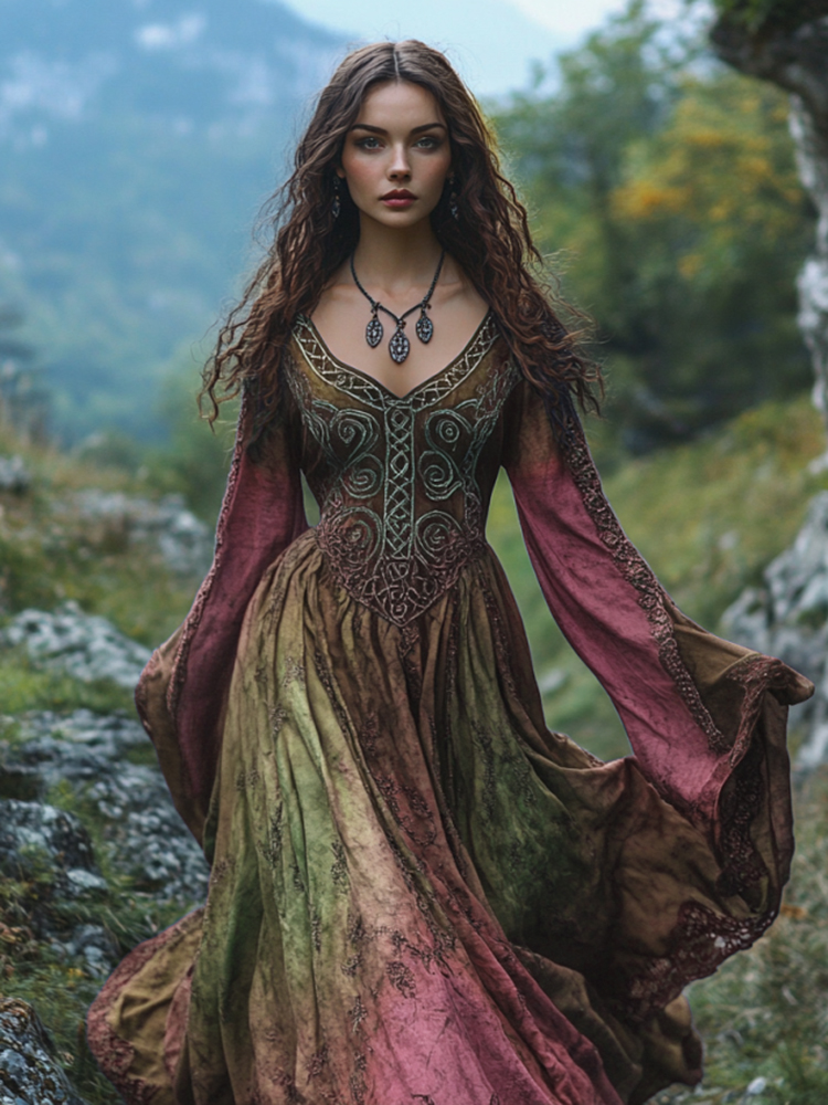 Viking Tribal Celtic Tree Of Life Gradient Lace Splicing Ruffle Midi Dress