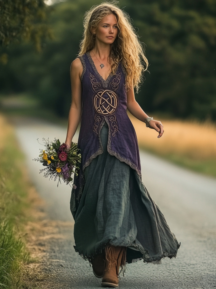 Vintage Viking Tribal Celtic Knot Embroidery Gradient Art Linen Tank Dress