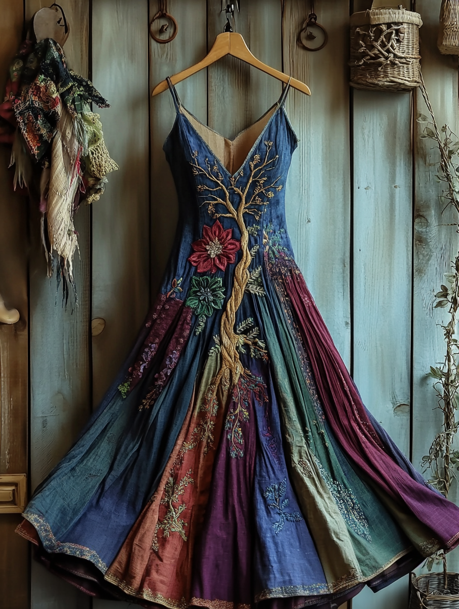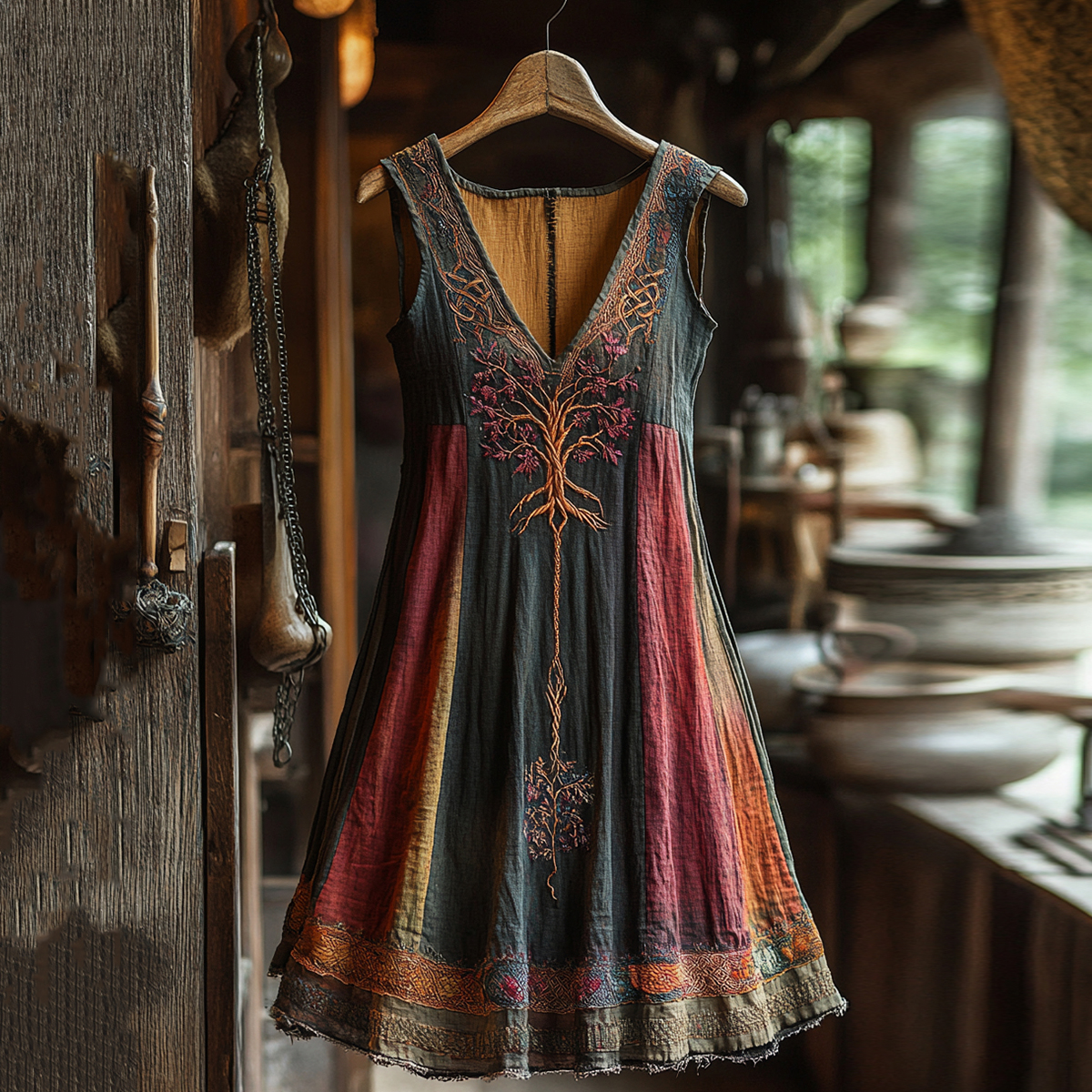 Women's Vintage Viking Tree Of Life Floral Stitching Sleeveless Midi Dress