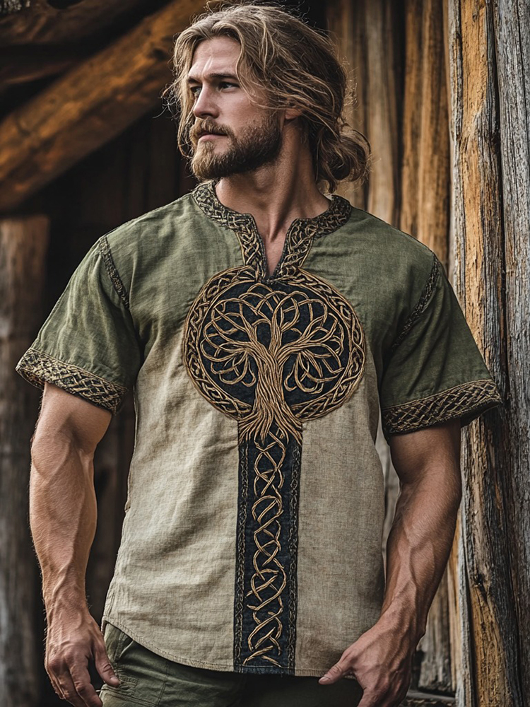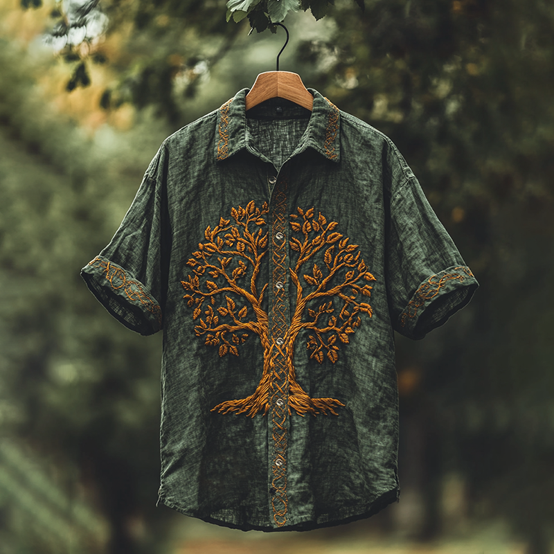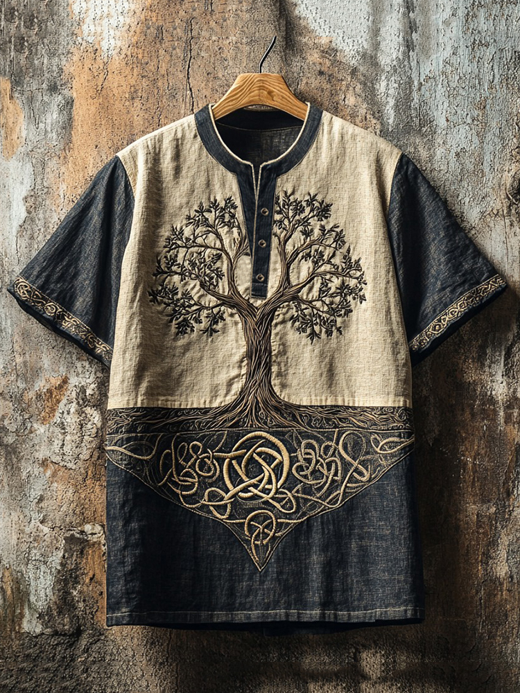 Men's Viking Tree Of Life Embroidery Pattern Linen Shirt