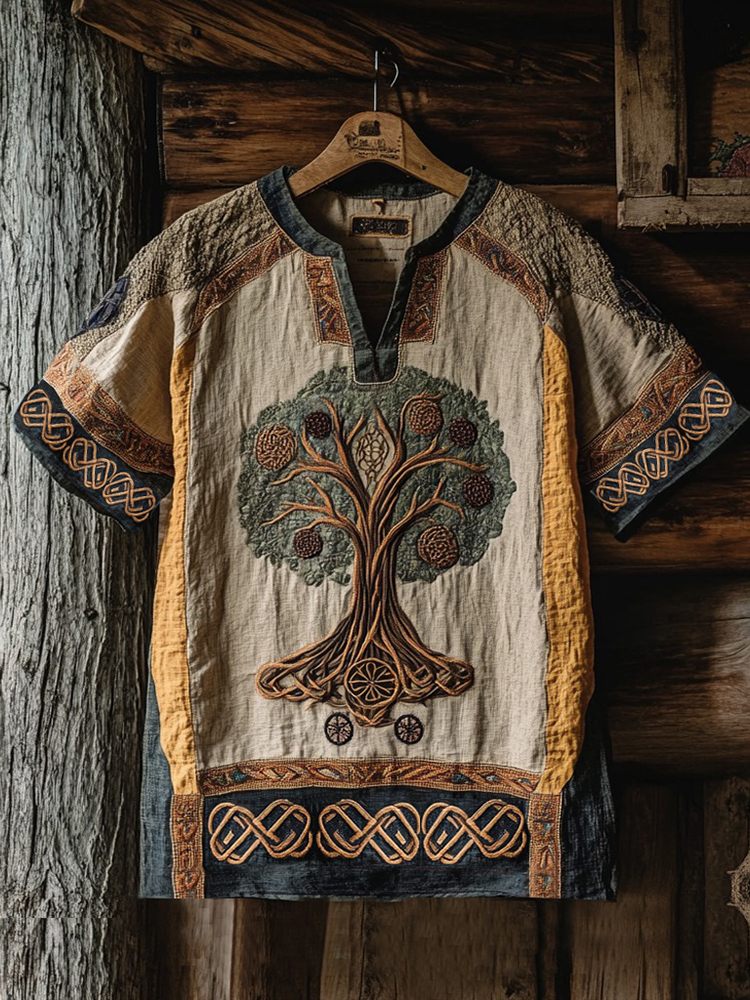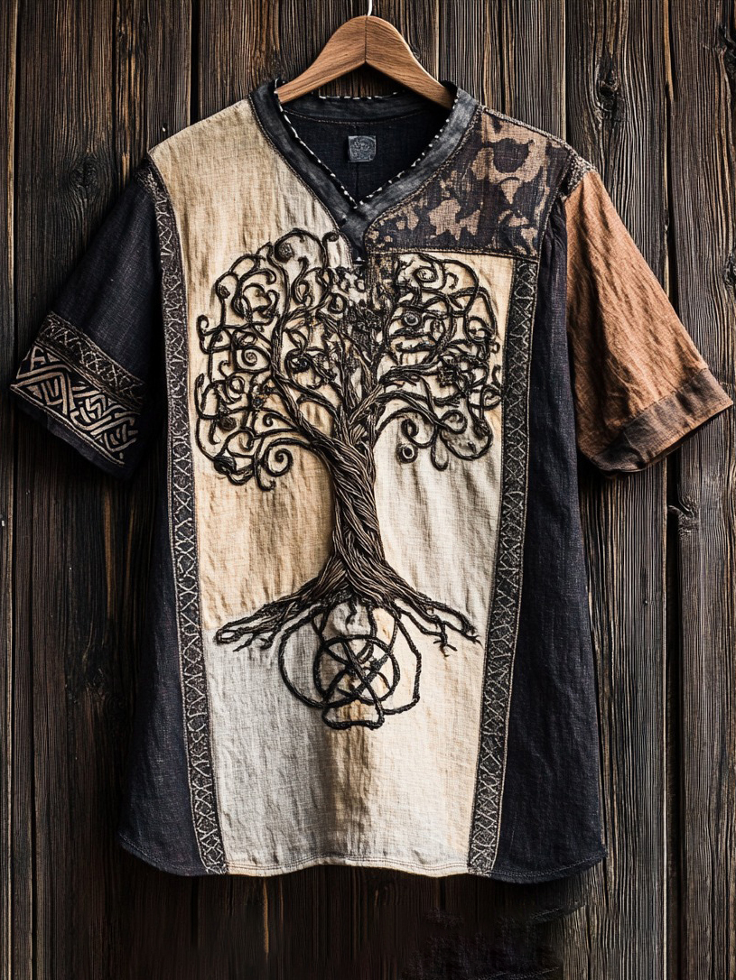 Men's Viking Tribal Tree Of Life Patchwork Design Linen T-shirt
