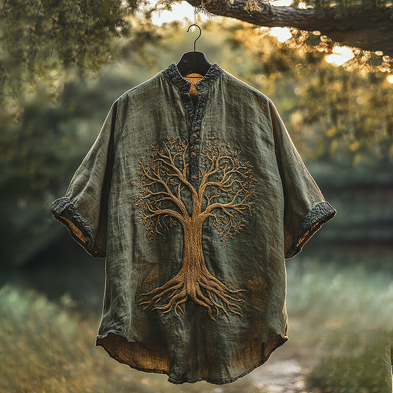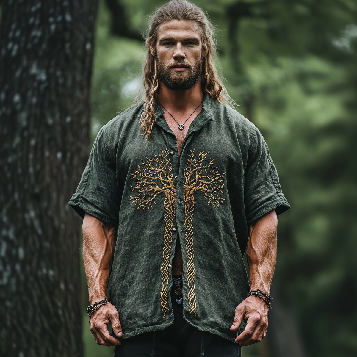 Men's Viking Tree Of Life Embroidery Linen Shirt