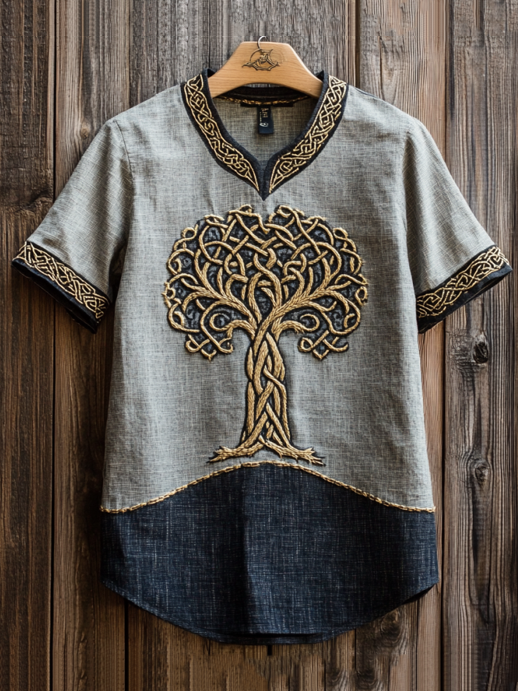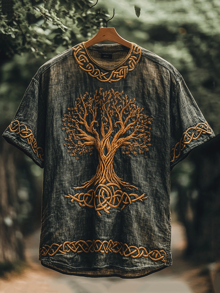Men's Viking Tribal Tree Of Life With Celtic Knotwork Embroidered Linen Round Neck T-shirt