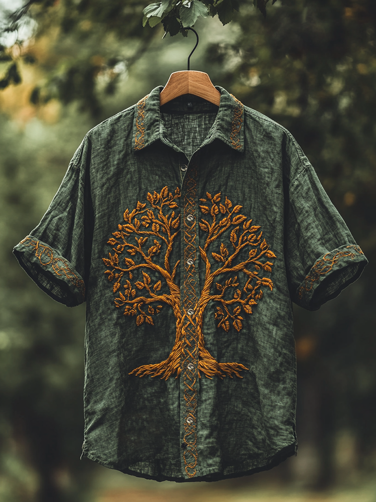 Men's Viking Tree Of Life Embroidery Pattern Lapel Shirt