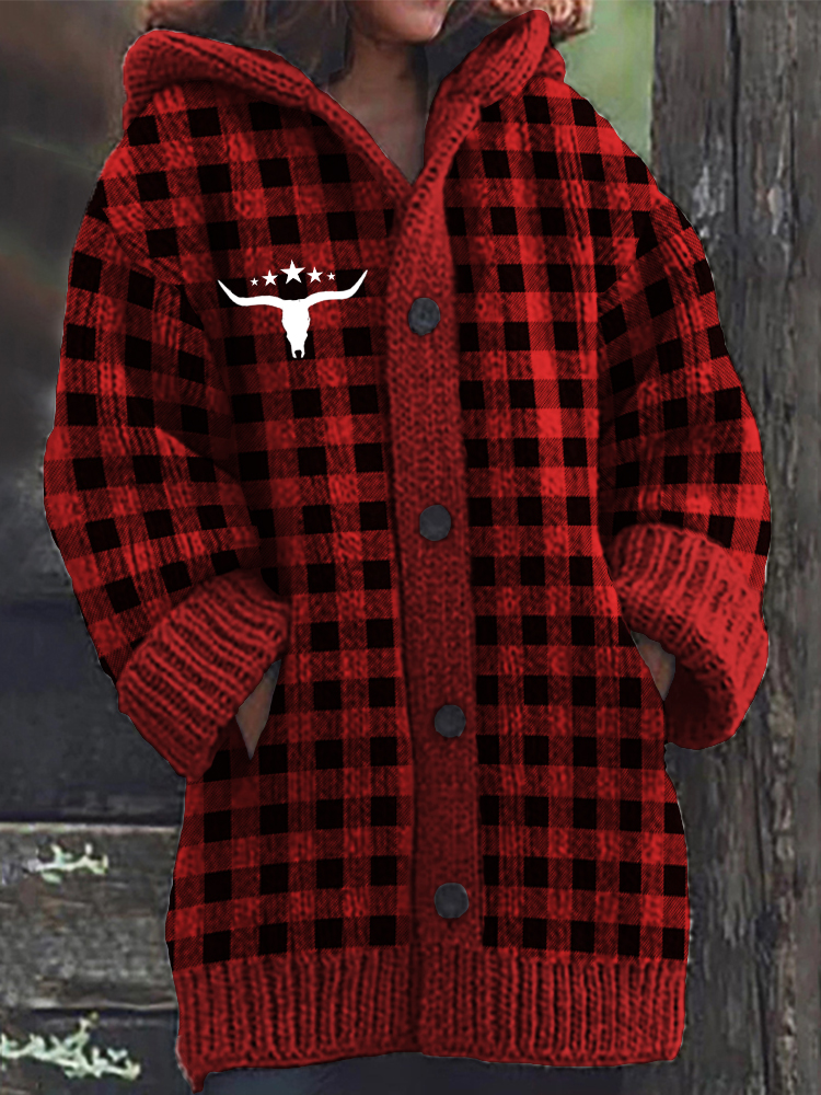 Bull Skull Vintage Check Cozy Knit Hooded Cardigan