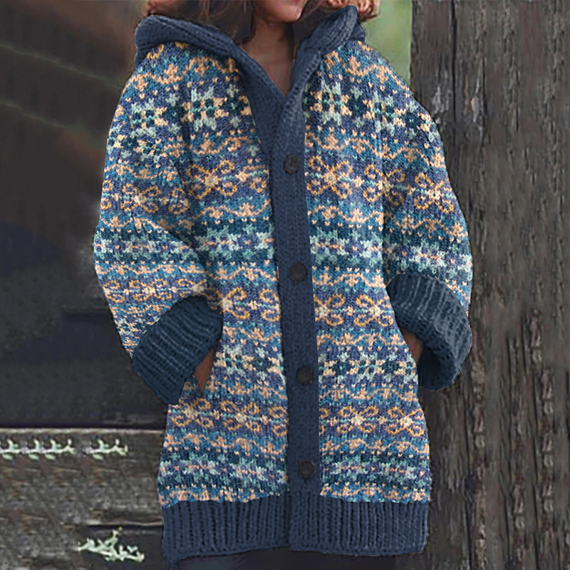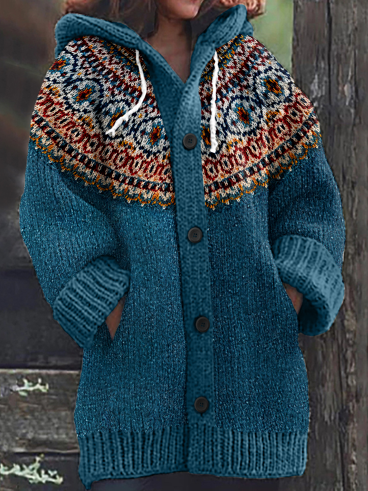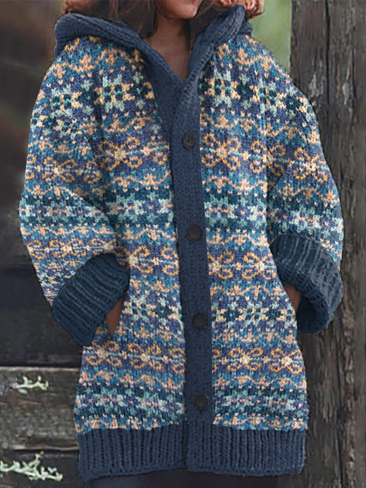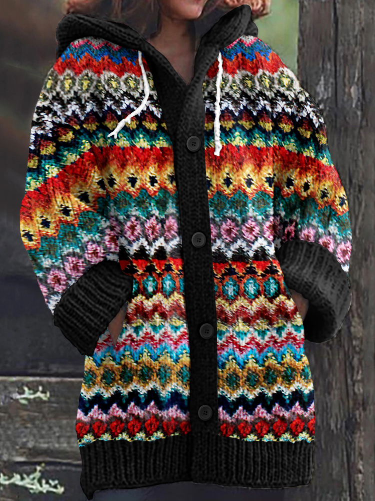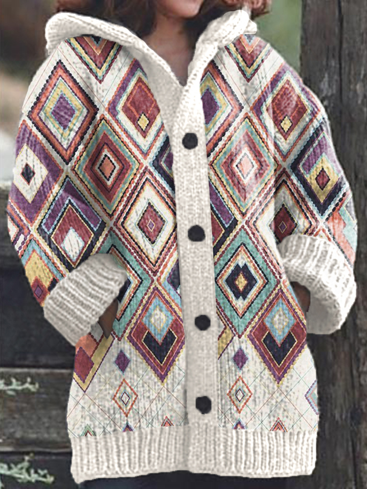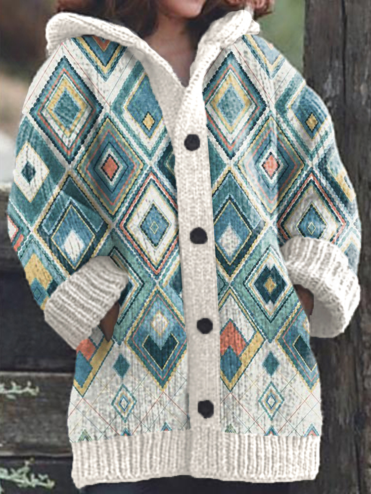 Vintage Geometric Pattern Knit Hooded Cardigan 1