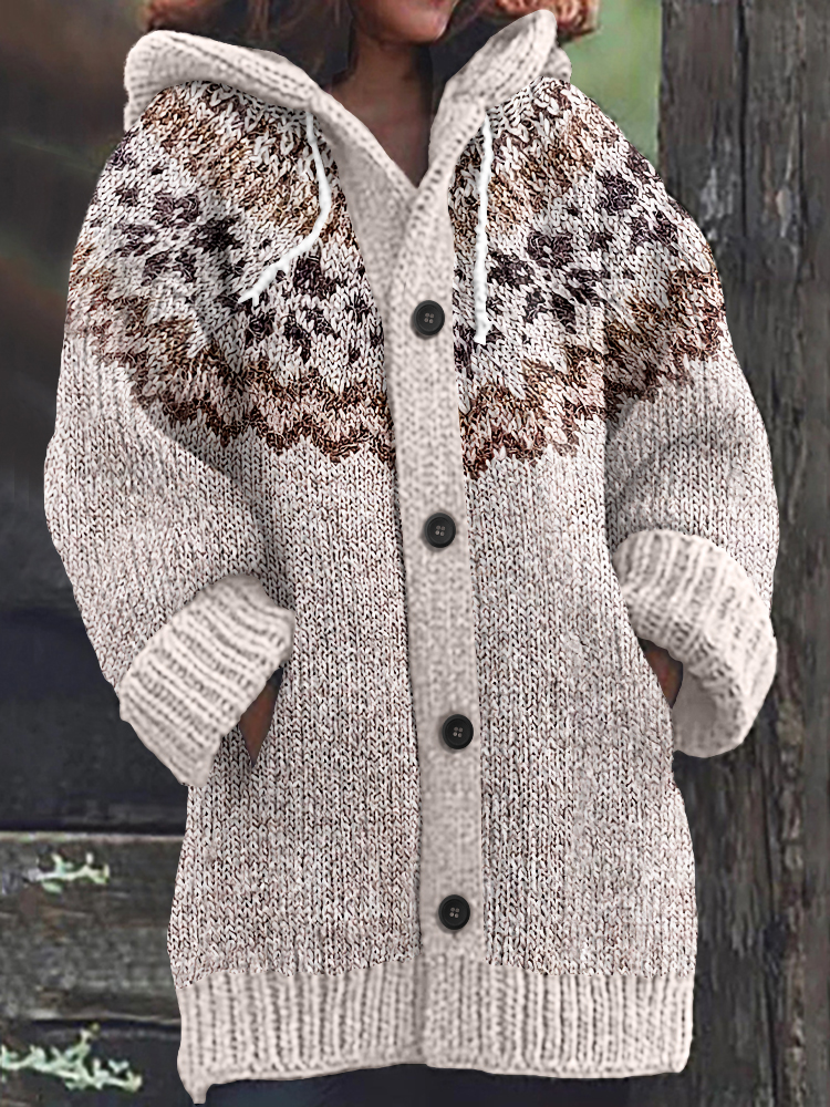 Vintage Iceland Knitted Print Hooded Cardigan Sweater