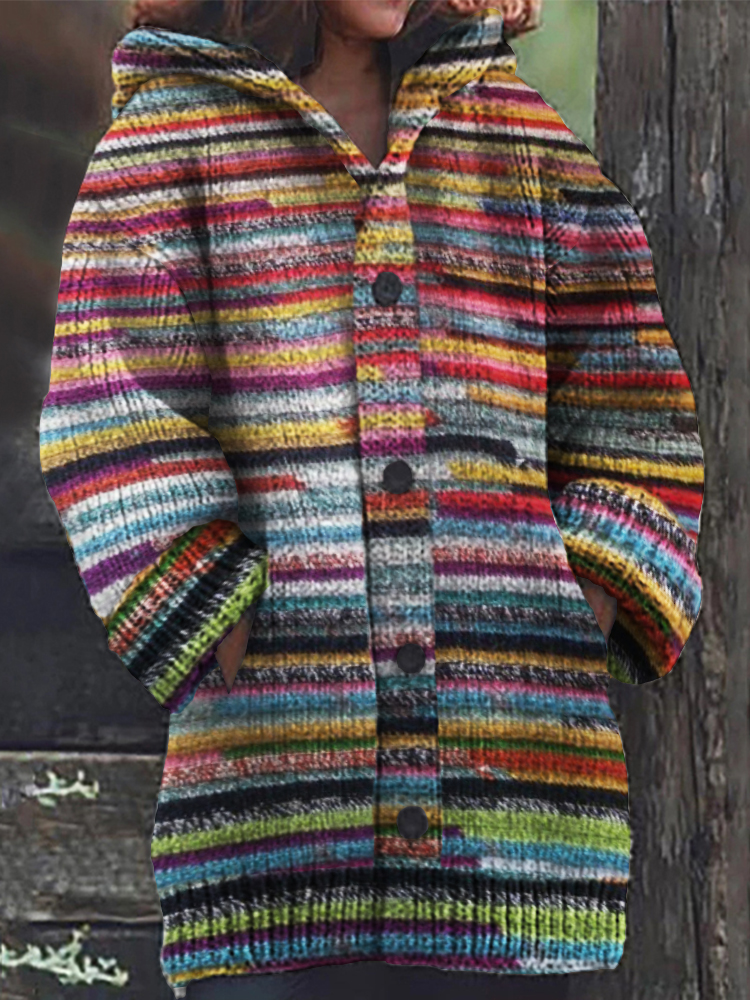 Vintage Mexican Striped Cozy Knit Hooded Cardigan