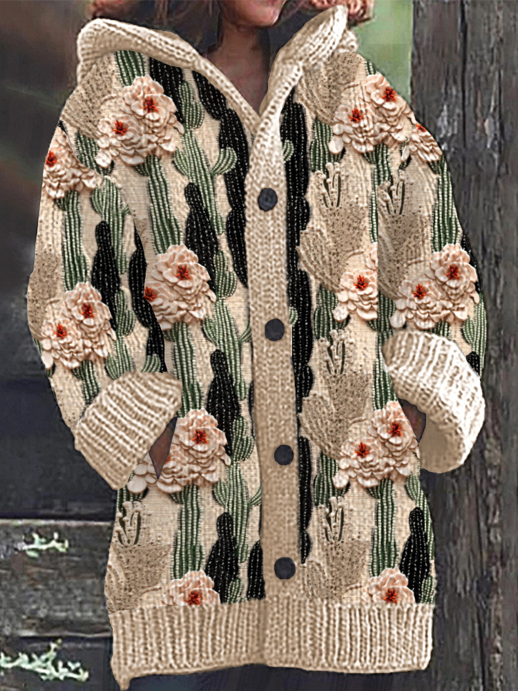 Cactus & Flower Embroidery Art Cozy knit Hooded Cardigan