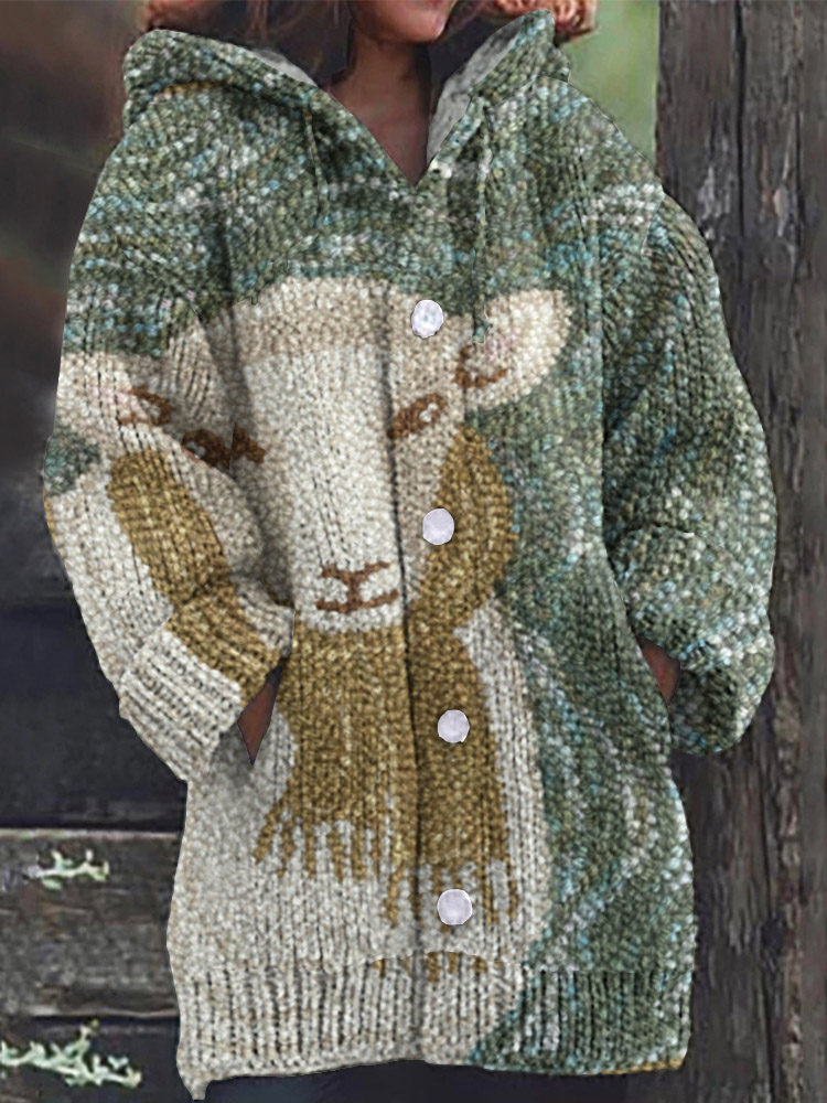 Vintage Chicken Graphic Cozy Knit Hooded Cardigan