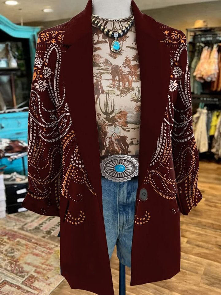Women's Vintage Crimson Paisley Floral Print 3/4 Sleeve Casual Blazer