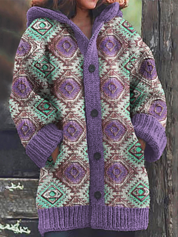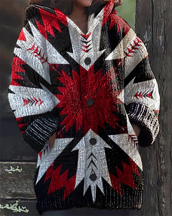 Women'S Native American Pattern Hooded Cardigan Sweater