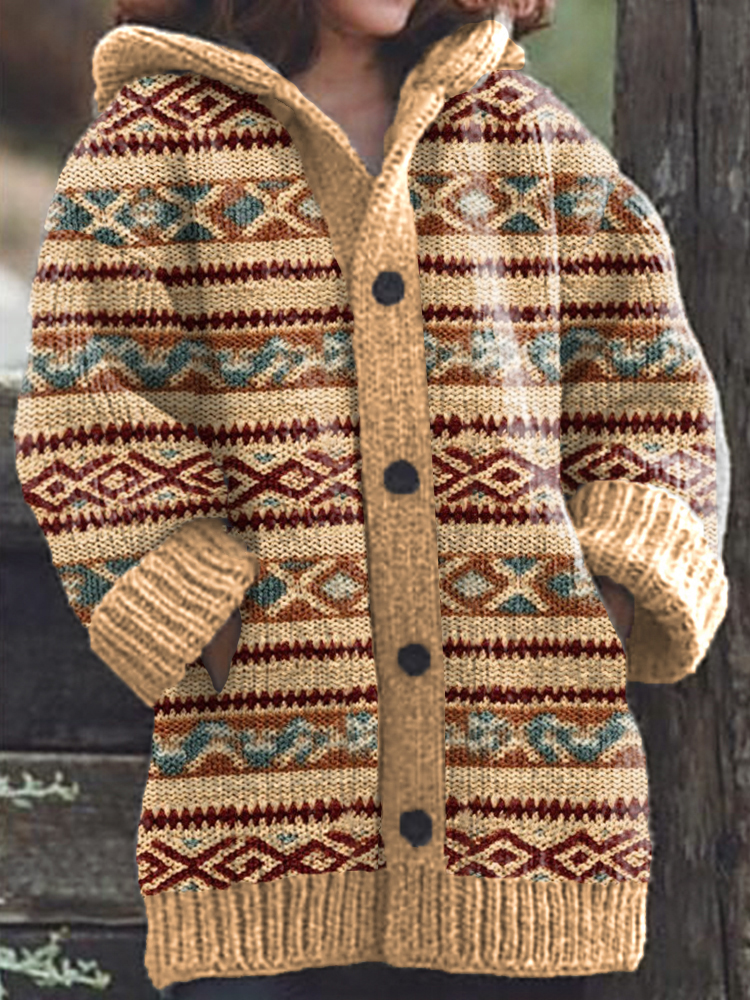 Vintage Geometric Pattern Knit Hooded Cardigan
