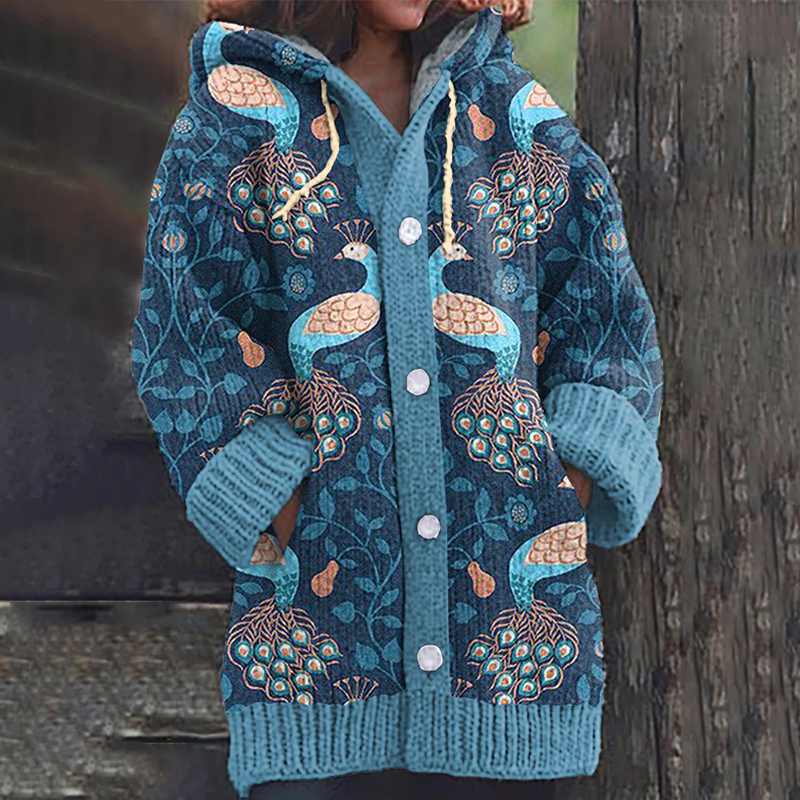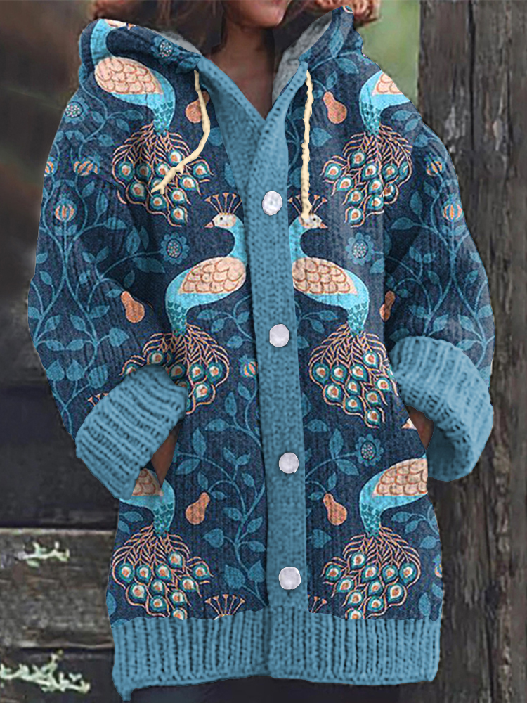 Japanese Art Flower Print Knitted Hooded Cardigan