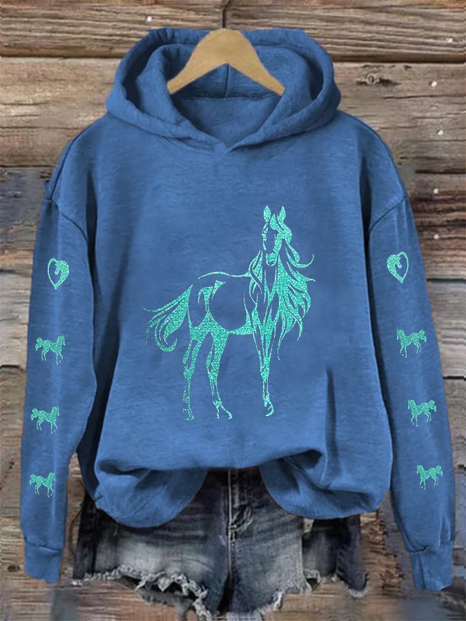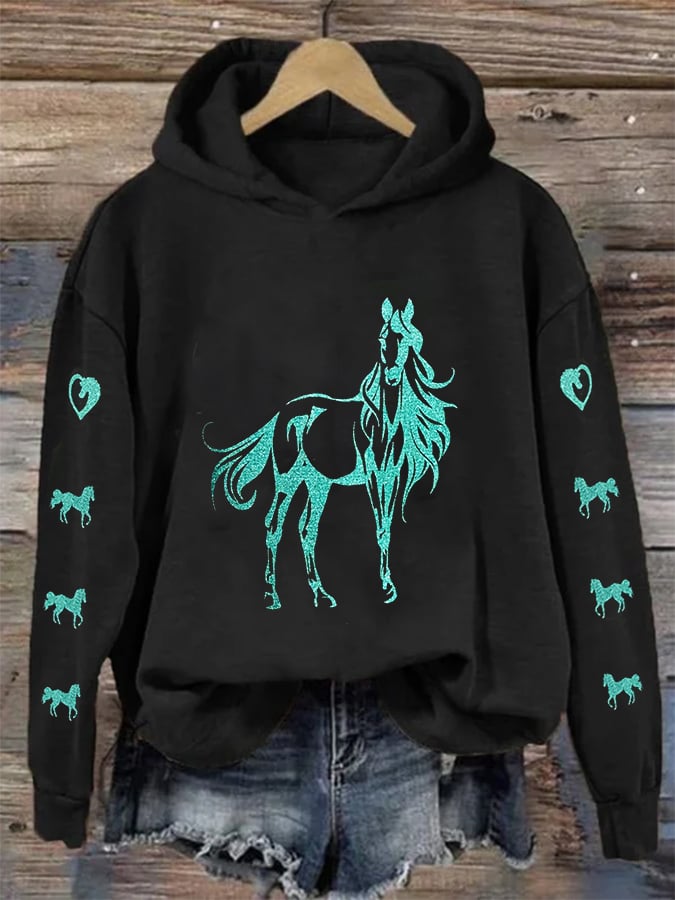 Women's Cat Dog Horse Silhouette Print Casual Pocket Hooded Sweatshirt
