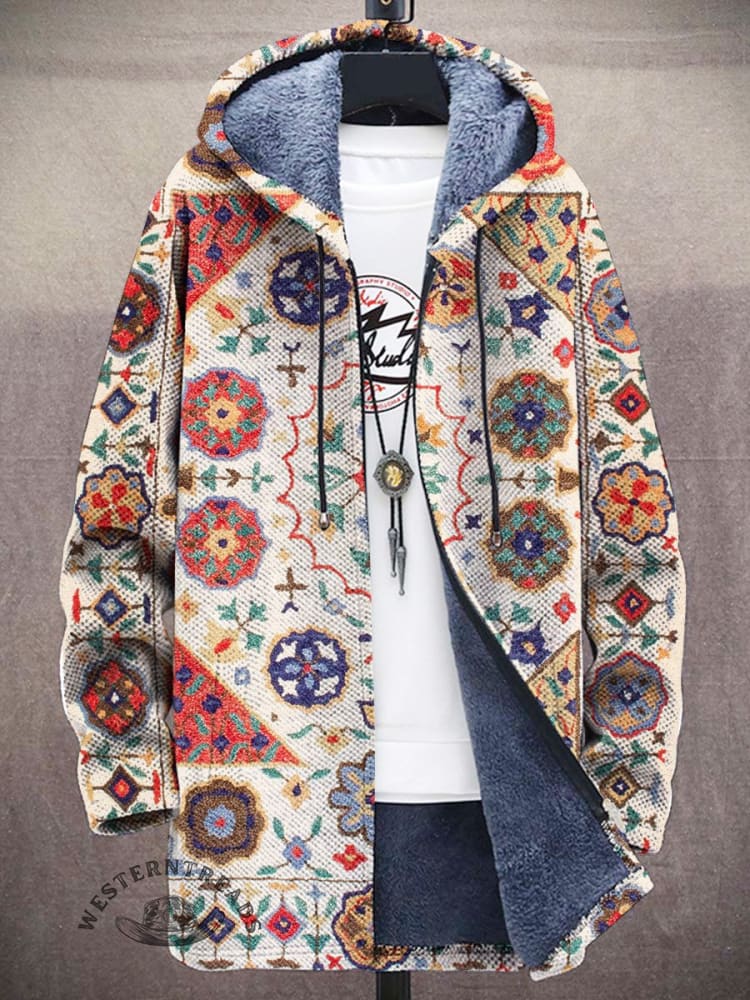 Unisex Retro Tribal Graphic Symmetrical Pattern Texture Print Plush Thickened Long Sleeve Cardigan Jacket