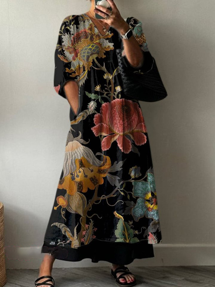 Women's Retro Floral Print Pocket V-neck Cotton Dress