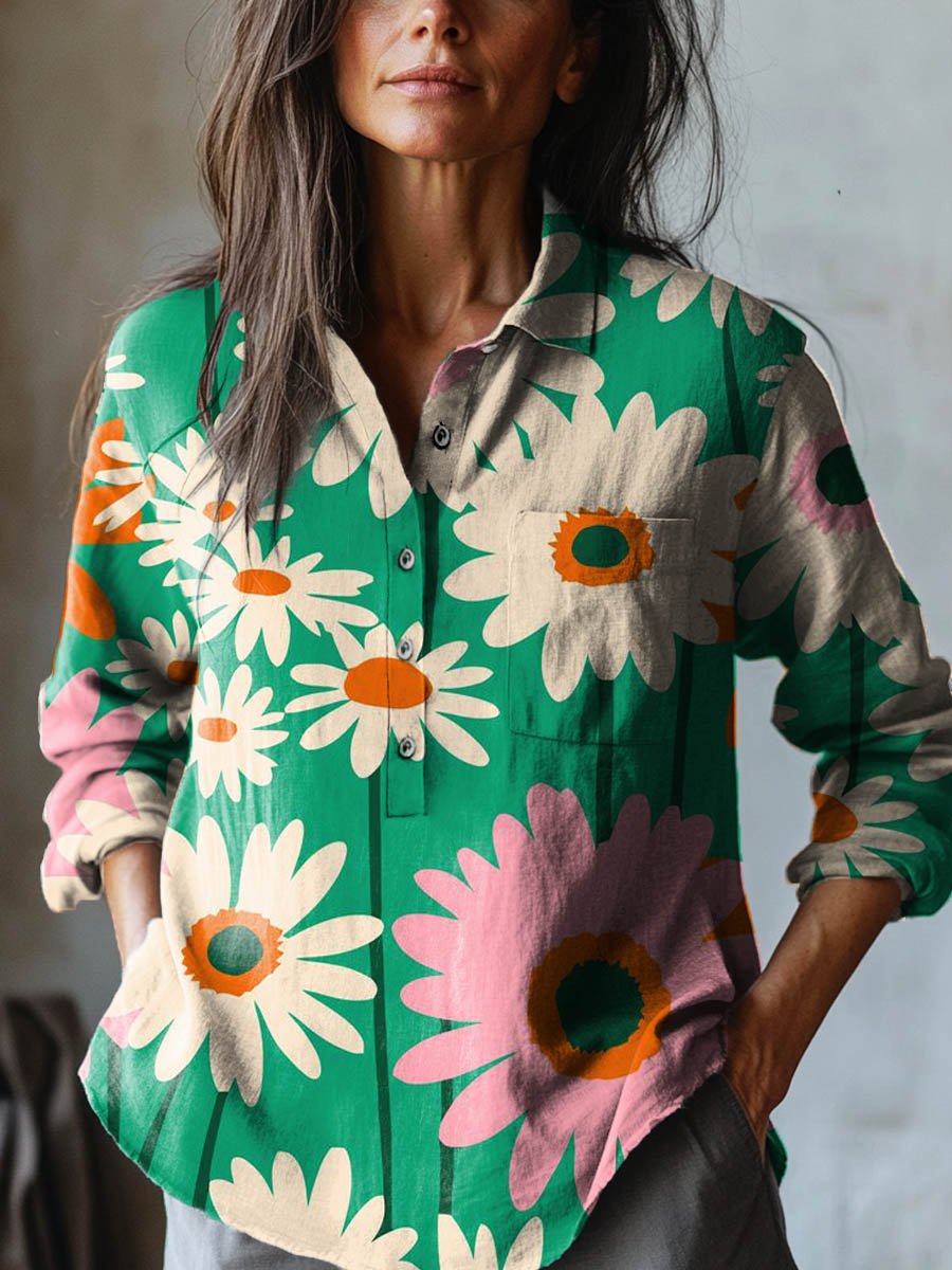 Women's Lovely Floral Art Print Casual Cotton And Linen Shirt