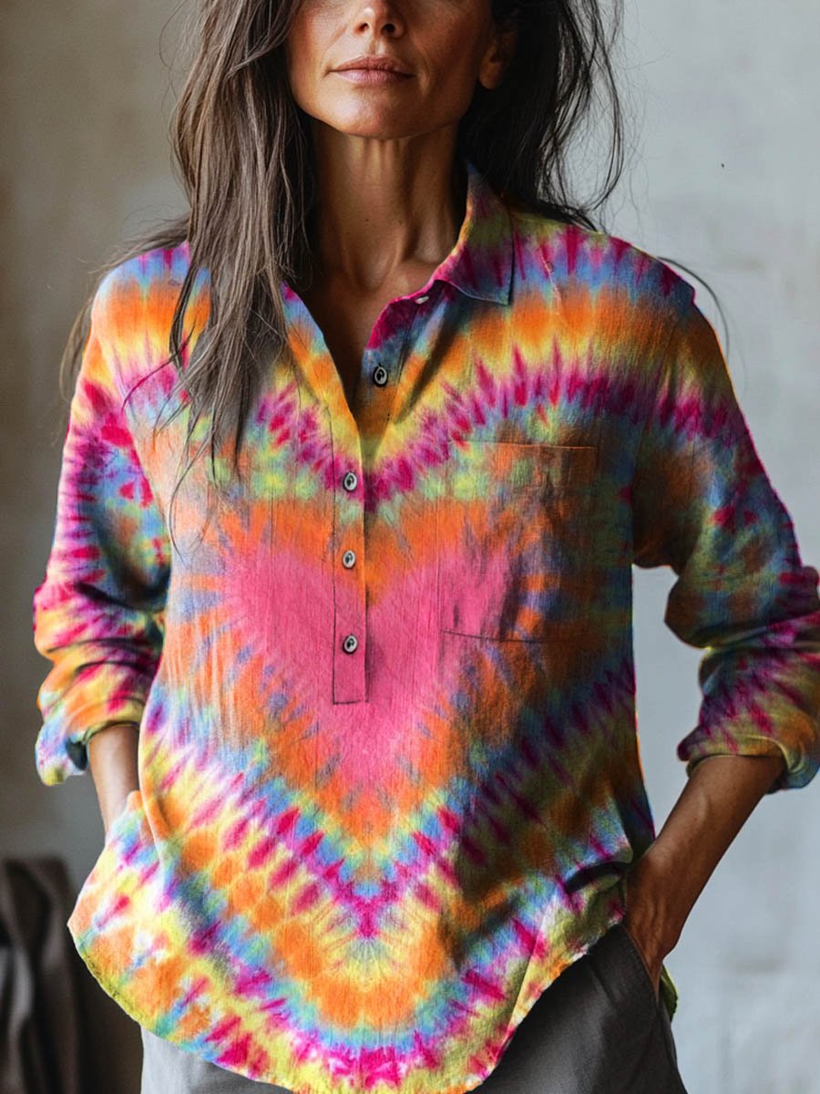 Women's Tie Dye Love Art Print Casual Cotton And Linen Shirt