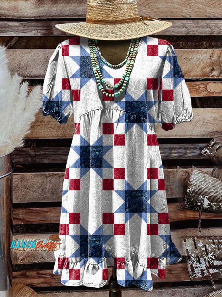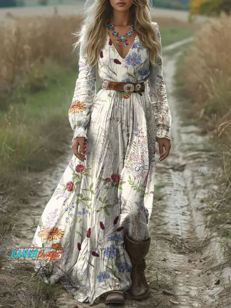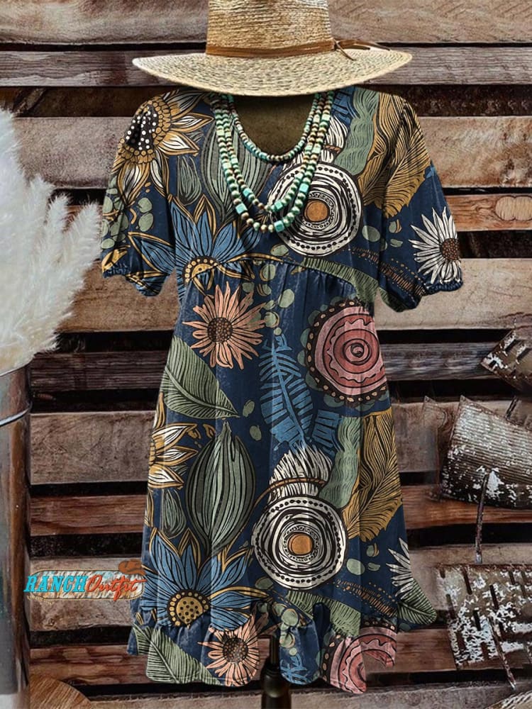 Women's Western Art Print V-Neck Button Pocket Cotton Dress