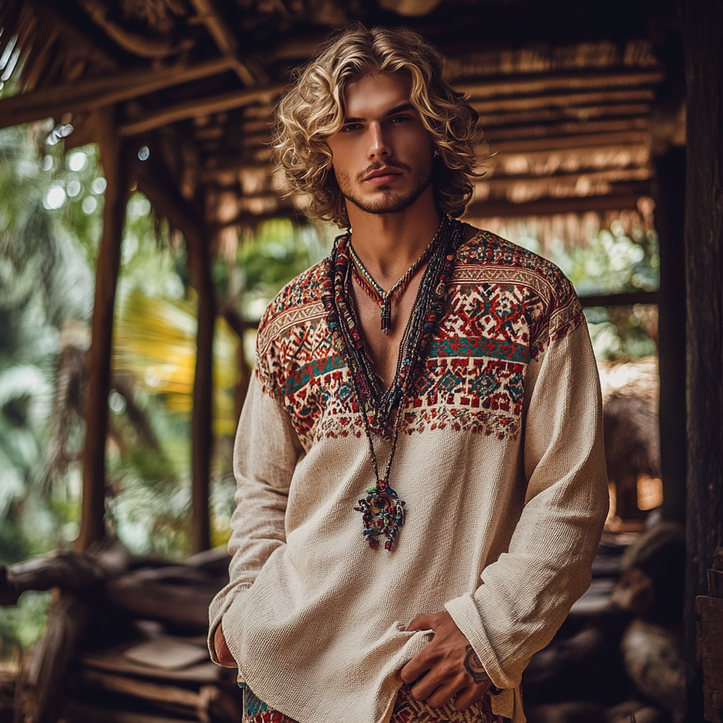 Men's Bohemian Holiday Style Vintage Linen Printed Casual Long Sleeve Top