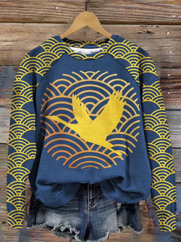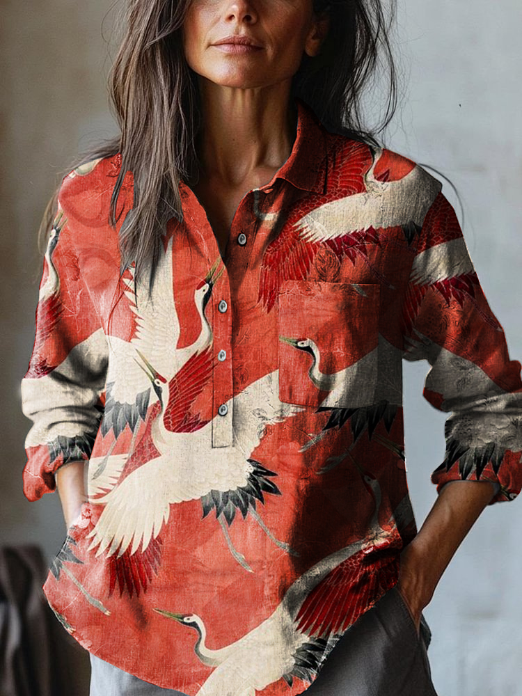 Women's Japanese Art Crane Art Print Casual Cotton And Linen Shirt