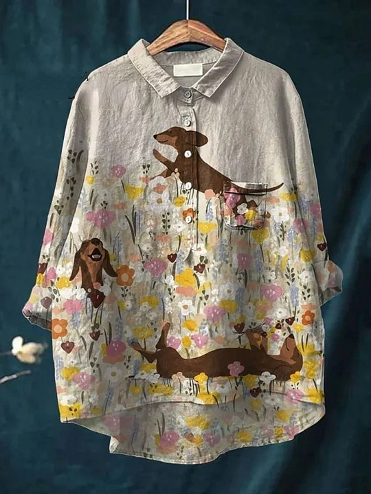 Dachshund In The Garden Art Print Casual Cotton And Linen Shirt
