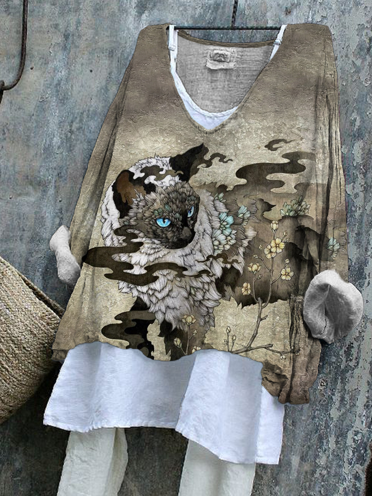 Vintage Cat Ink Print Flowy Tunic
