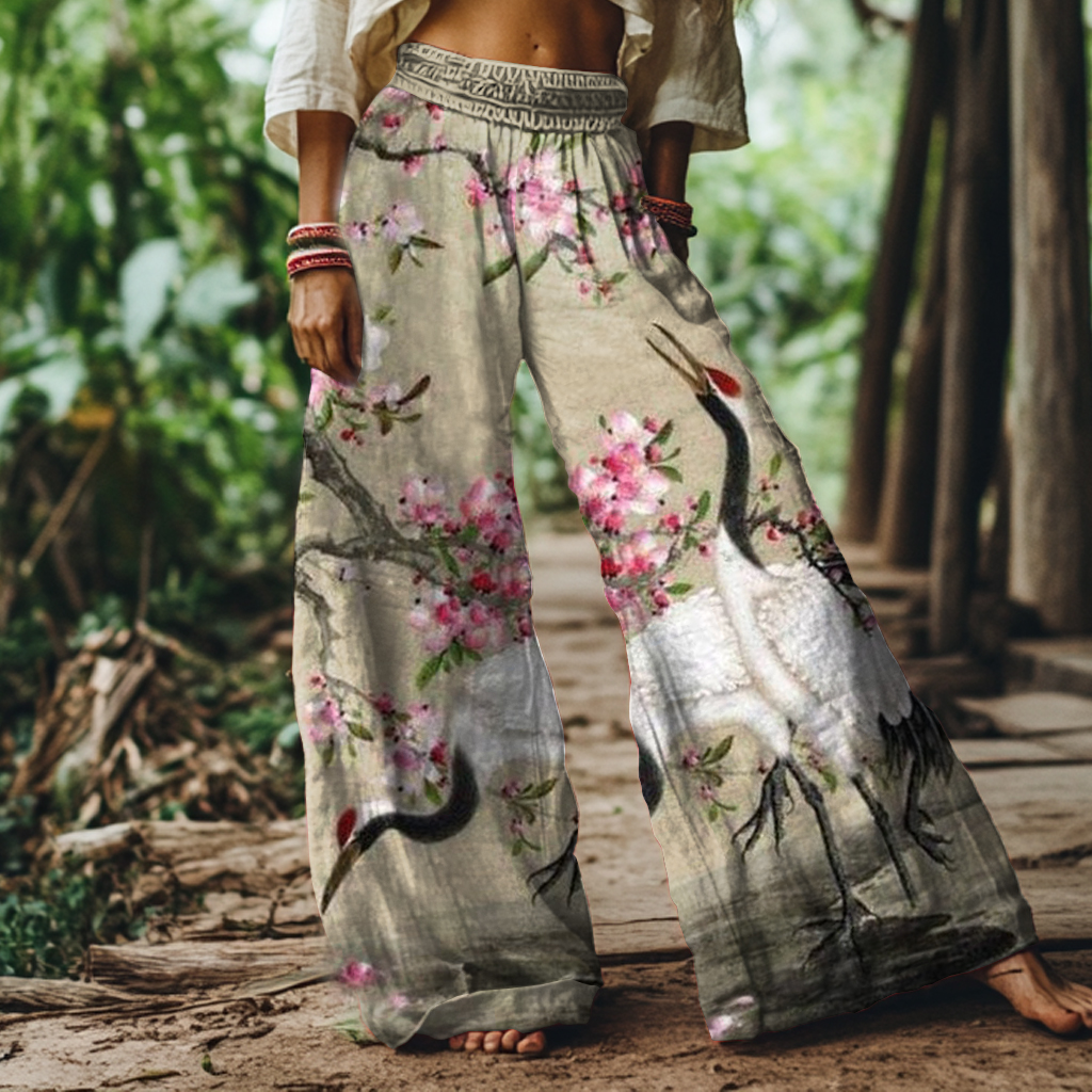 Vintage Plum Blossom and Crane Art Print Loose Pants