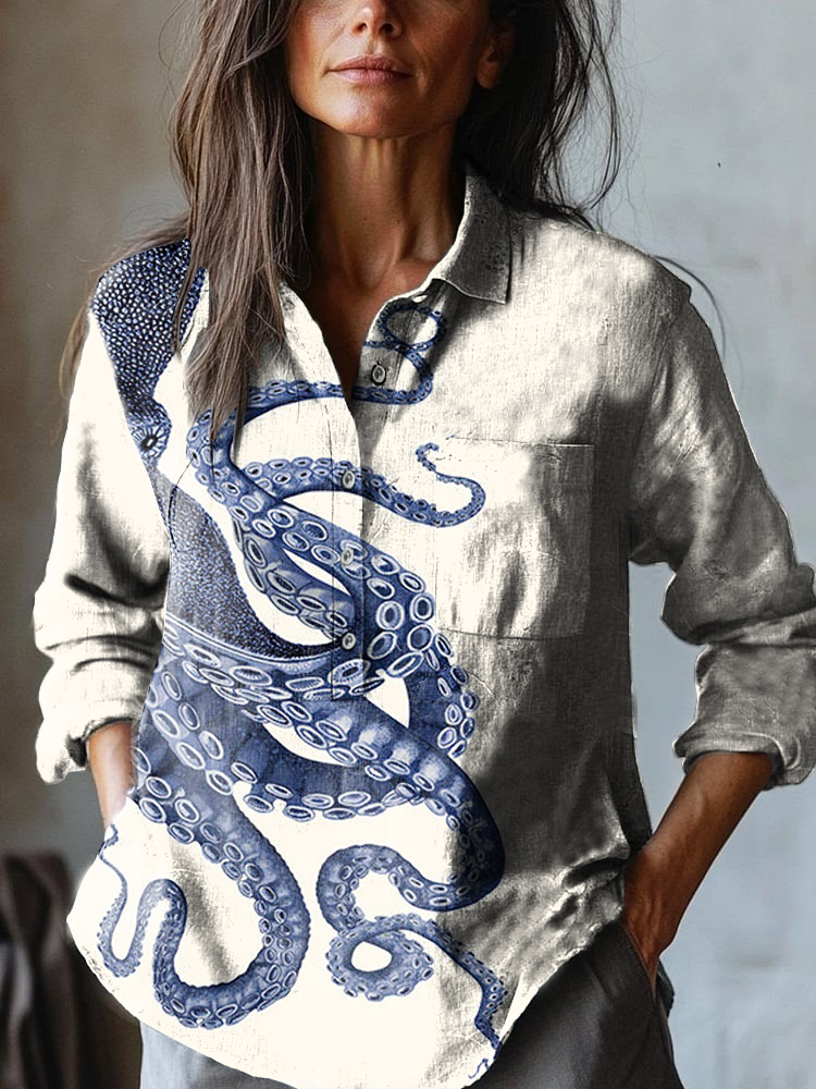 Women's Japanese Octopus Art Print Casual Cotton and Linen Shirt