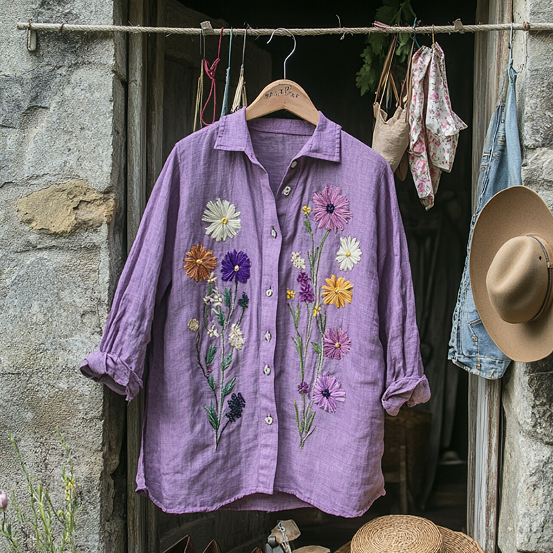 Women's Vintage Ethnic Floral Art Print Casual Cotton And Linen Shirt