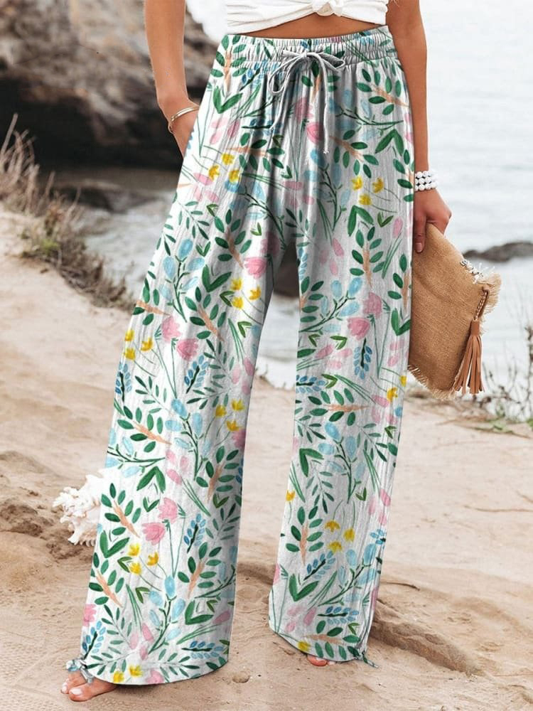 Watercolor Summer Garden Pattern Printed Women's Cotton And Linen Casual Pants