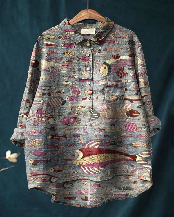 Women's Vintage Fish Art Print Casual Cotton Linen Shirt