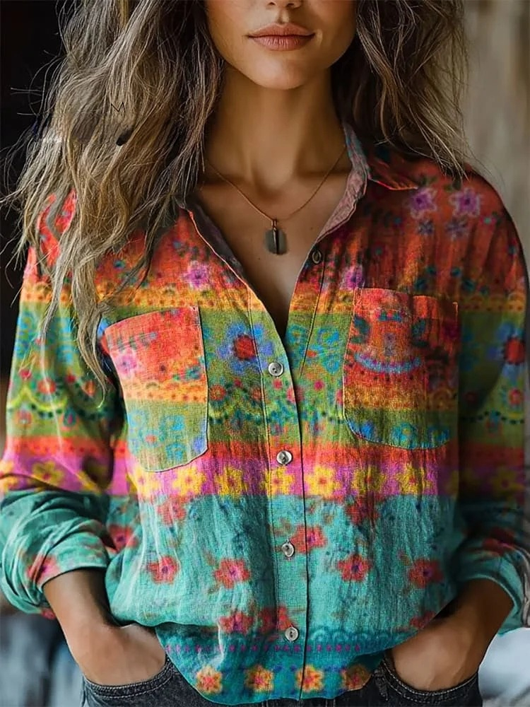 Women's Retro Floral Art Print Casual Long Sleeve Comfortable Cotton Shirt