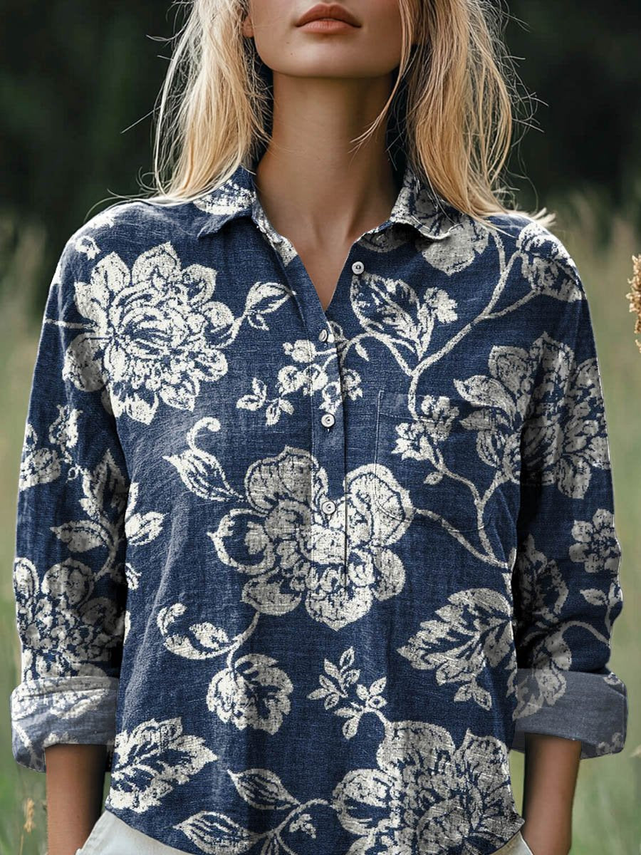 Women's Vintage Flower Art Print Casual Cotton And Linen Shirt
