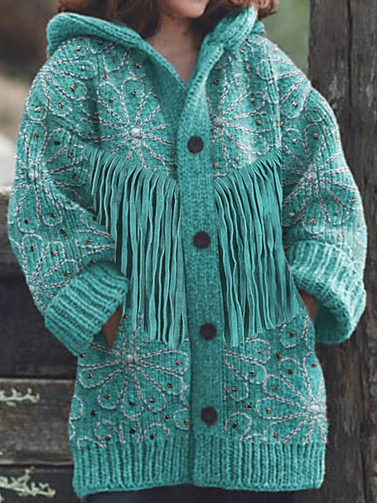 Floral Embroidery Pattern Fringe Knit Hooded Cardigan
