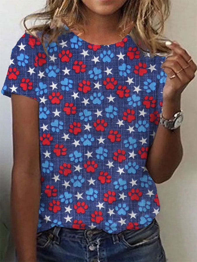 Women's Independence Day flag element dog paw print crew neck T-shirt