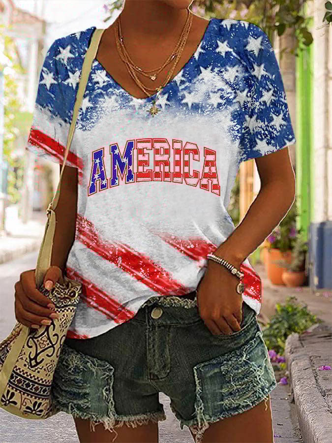Women's Independence Day America Print V-Neck T-Shirt