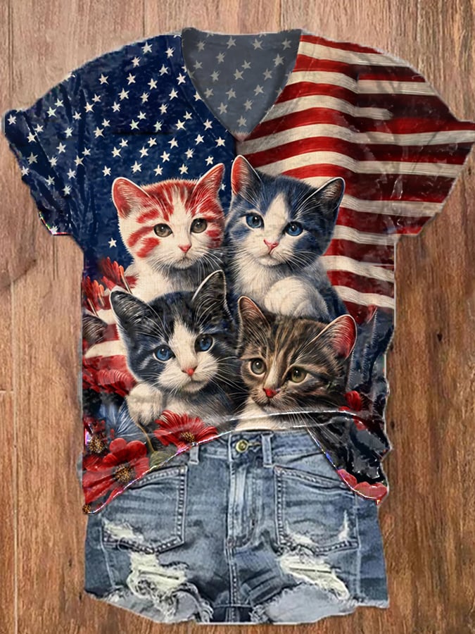 Women's Retro Distressed American Flag Cat Print Casual T-Shirt